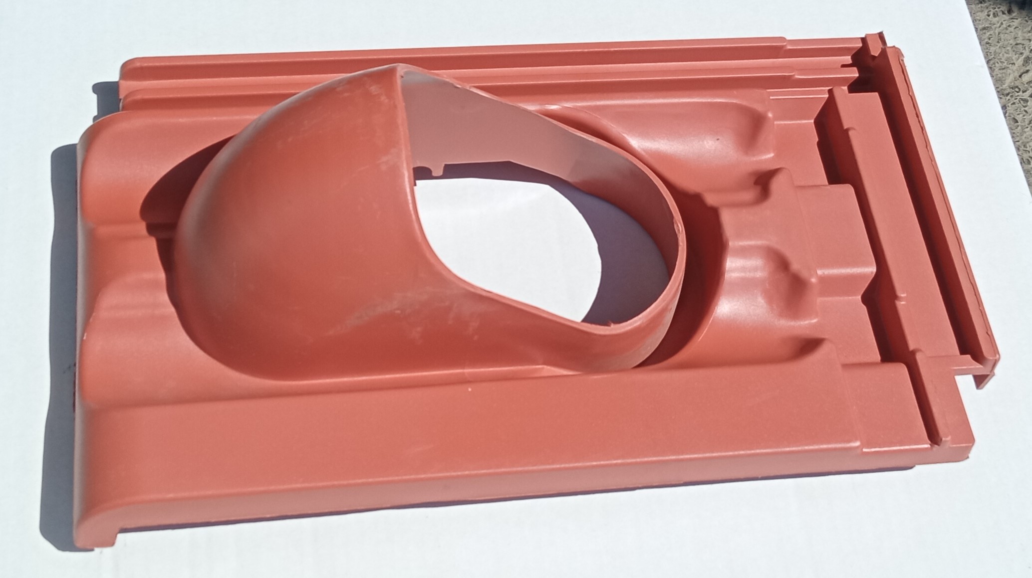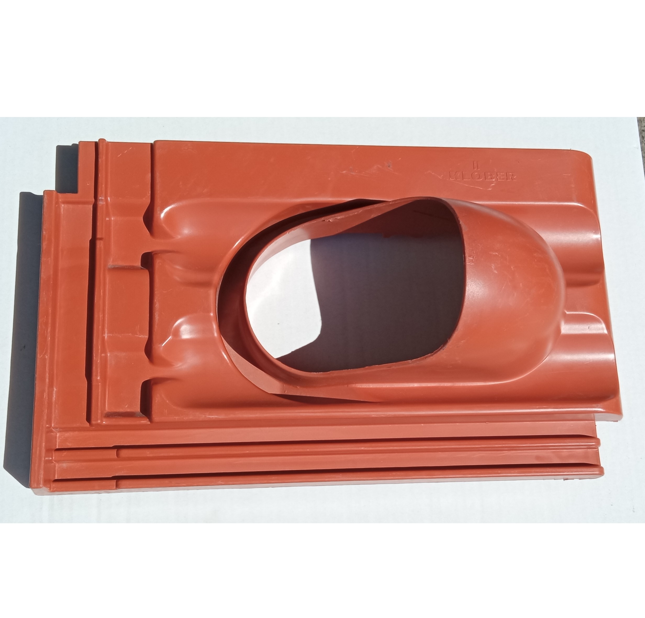 Klöber műanyag alapcserép Csárdás/Tangó téglavörös tetőcserepekhez antennakivezető, csatornaszellőző, szolár, füstgázkivezető és helységkiszellőztető adapter fogadására és rögzítésére alkalmas – kemény PVC anyagú – cserép. Rögzítése a lécezéshez szükséges